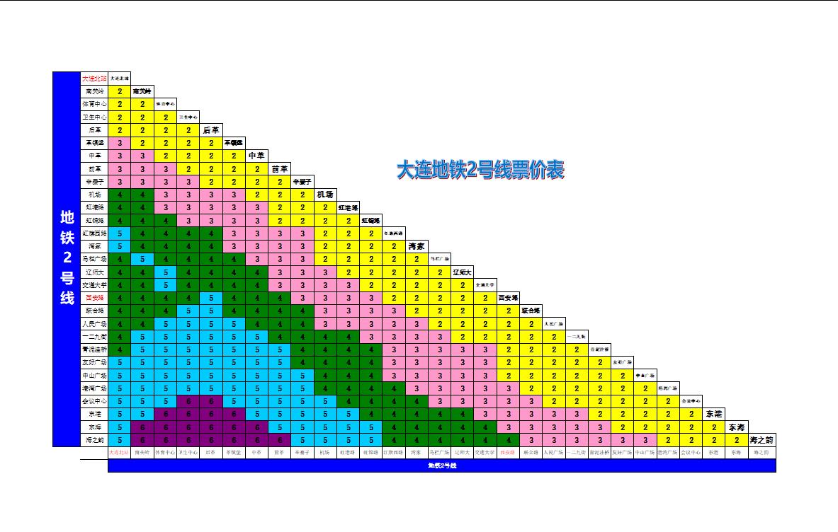 大连北站—南关岭—体育中心—卫生中心—后革—革镇堡—中革—前革—辛寨子—机场—虹港路—虹锦路—红旗西路—湾家—马栏广场—辽师大—交通大学—西安路—联合路—人民广场—一二九街—青泥洼桥—友好广场—中山广场—港湾广场—会议中心—东港—东海—海之韵